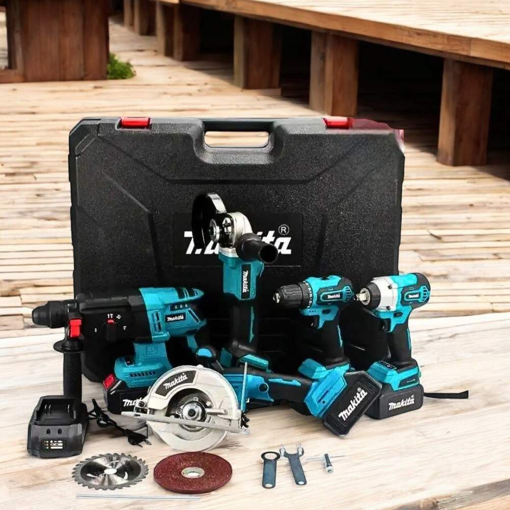 Набір інструментів Makita 36V 5 в 1 представляє собою універсальний комплект, який включає п’ять ключових інструментів, необхідних для виконання найрізноманітніших завдань: шуруповерт, болгарка, перфоратор, гайковерт і циркулярна пила. З цим набором ви отримаєте все необхідне для професійного ремонту, будівництва та домашнього господарства. Акумуляторна система 36V забезпечує надійну продуктивність і тривалий час роботи без необхідності постійного підключення до електромережі.